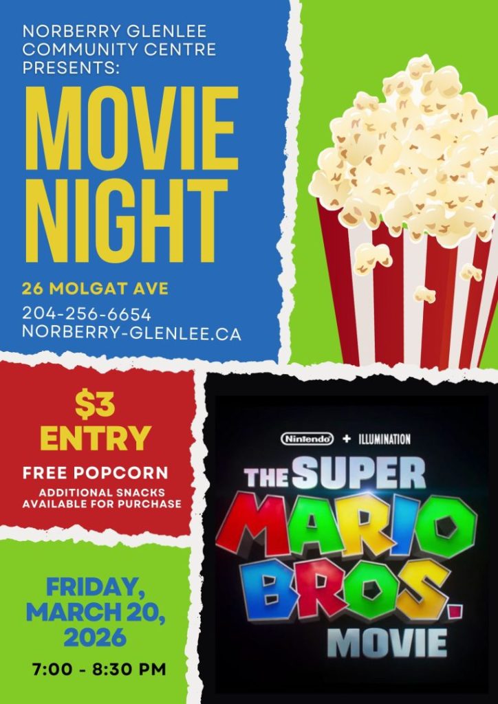 Next up on our event calendar is our Family Movie Night, which will take place on Friday, March 20th from 7-9 pm at the Norberry site on Molgat Avenue. Make sure you save the date on your calendar!